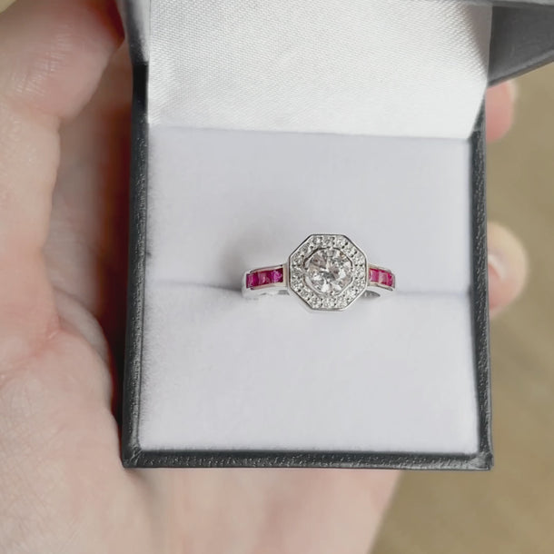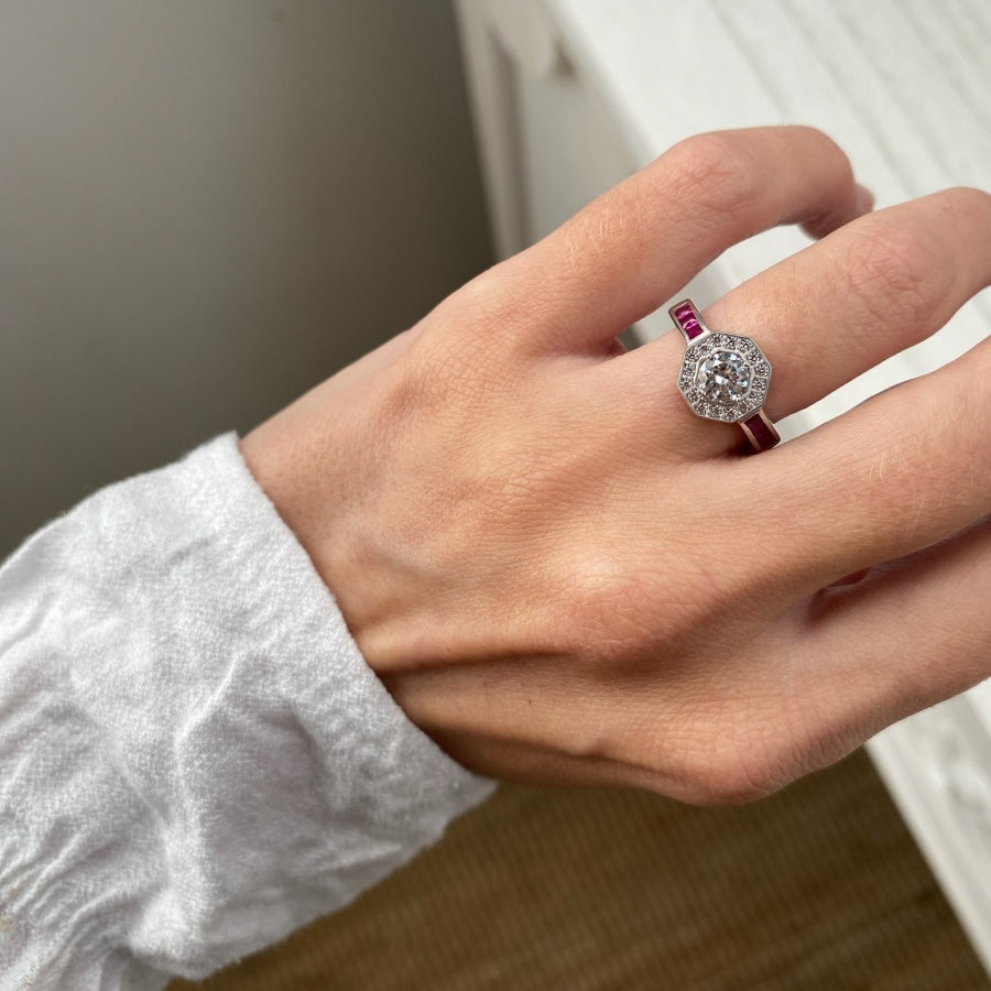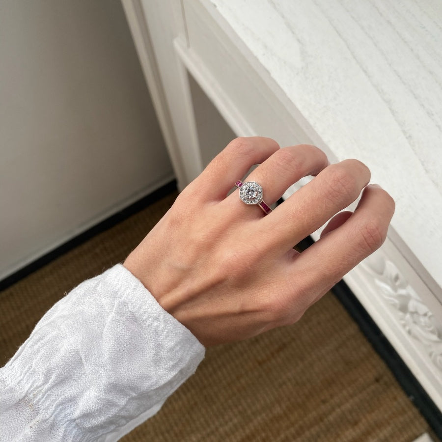- Piedras laterales engastadas en talla carré. Caracter muy común en las joyas Art Decó. Este estilo de engaste resalta la geometría y la simetría.