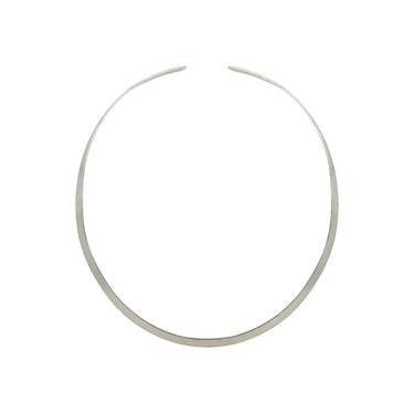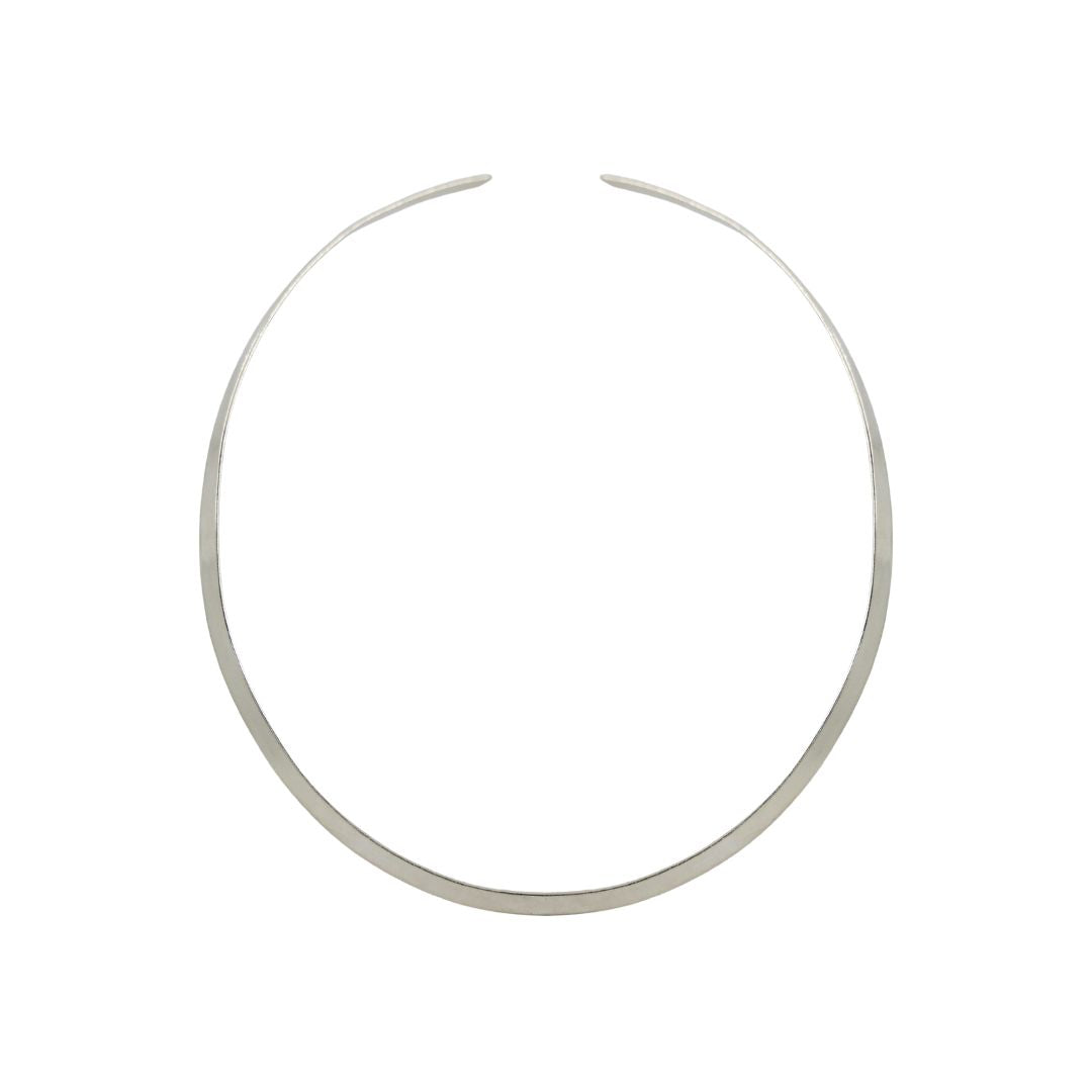 Gargantilla Harper Plateada. Fabricada en latón pulido, su diseño rígido y abierto se adapta cómodamente al cuello, aportando un brillo que realza cualquier look.