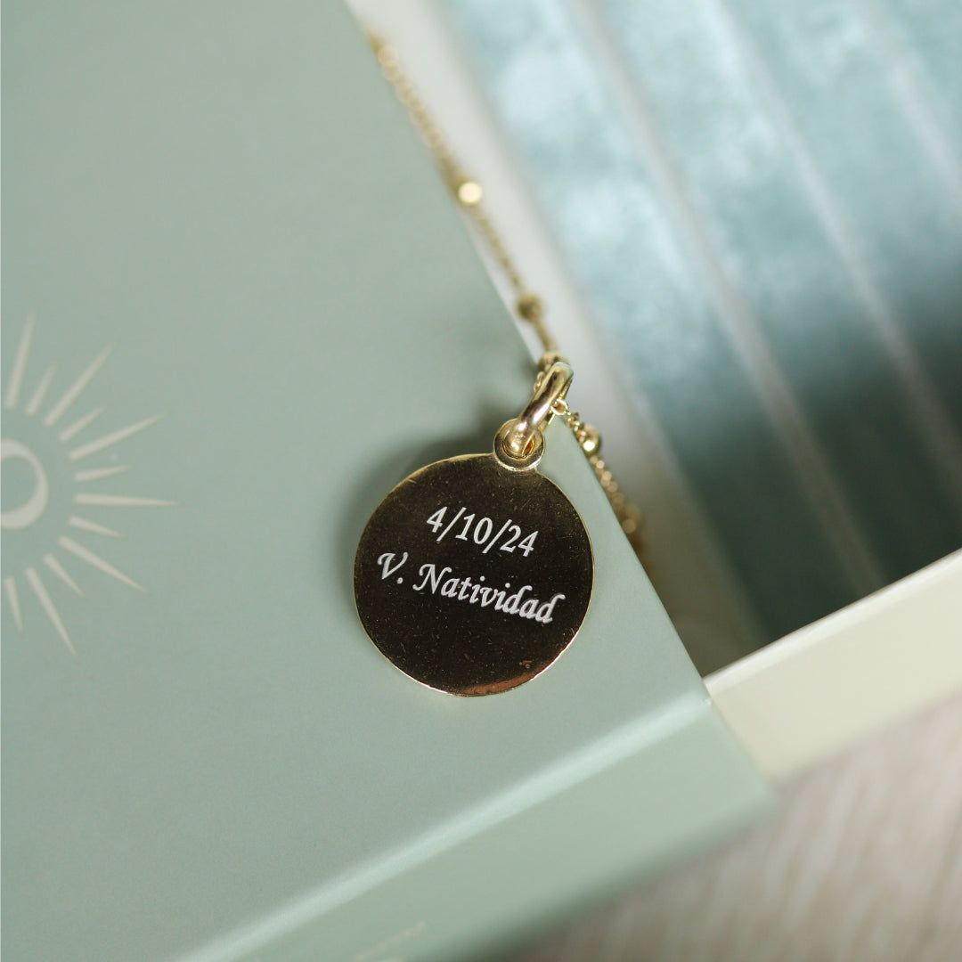 Tiene 20 mm de diámetro. Por detrás es lisa por lo que puedes personalizar una fecha o una frase. Y si quieres, añade una cadena de plata o plata chapado en oro para que luego pueda llevarla colgada siempre consigo.