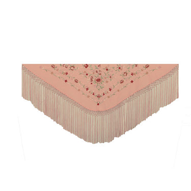 Fabricado en American crépe silk. Hilo bordado seda/viscosa. Flecos de seda/viscosa. Mide 150 cm de ancho por 50 cm de alto. Los flecos miden aproximadamente 30 cm de largo.