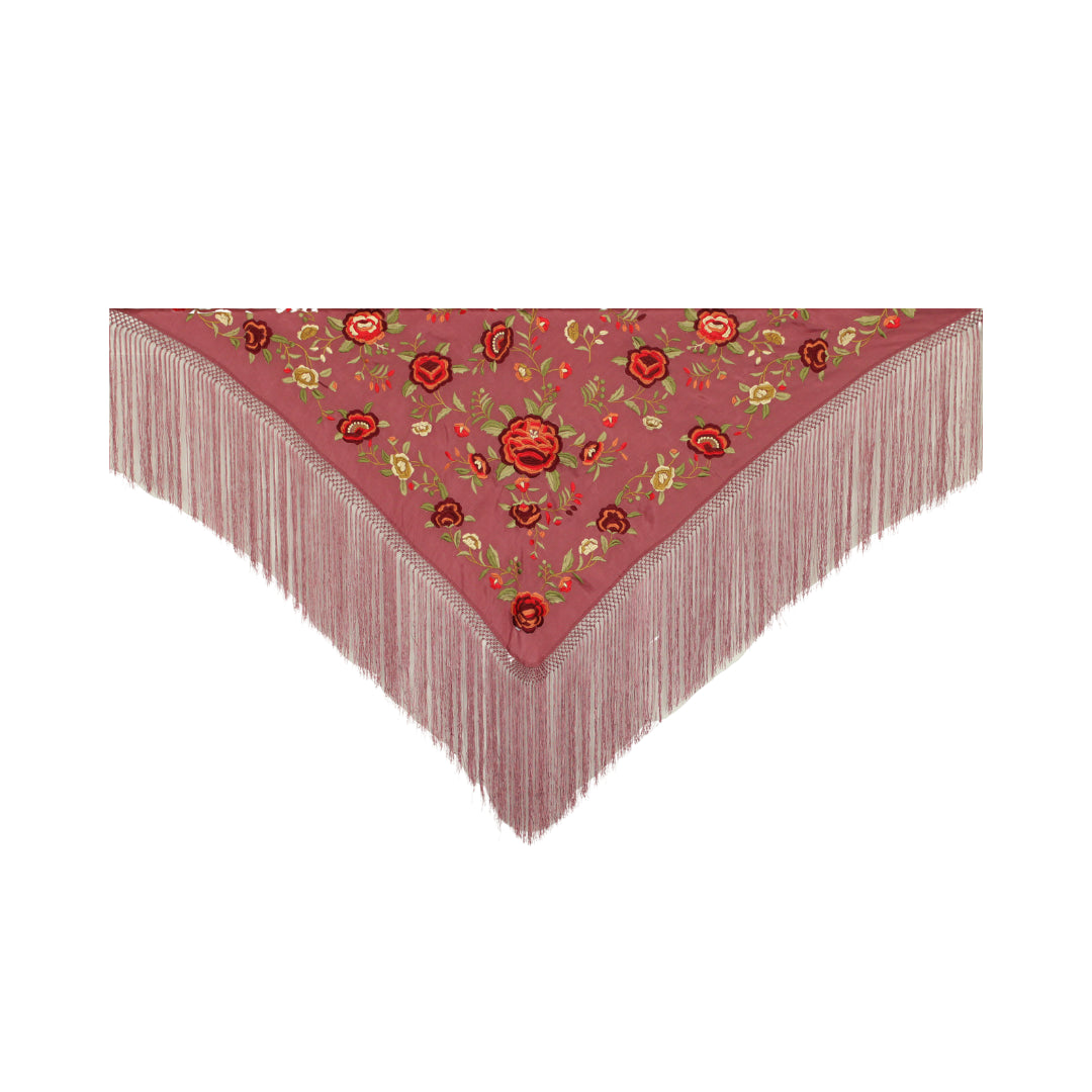 El mantón está bordado en seda de algodón. El enrejado está hecho a mano a tono con el mantón. Mide aproximadamente 130 cm de ancho y 65 cm de alto. Los flecos miden 30 cm de largo.
