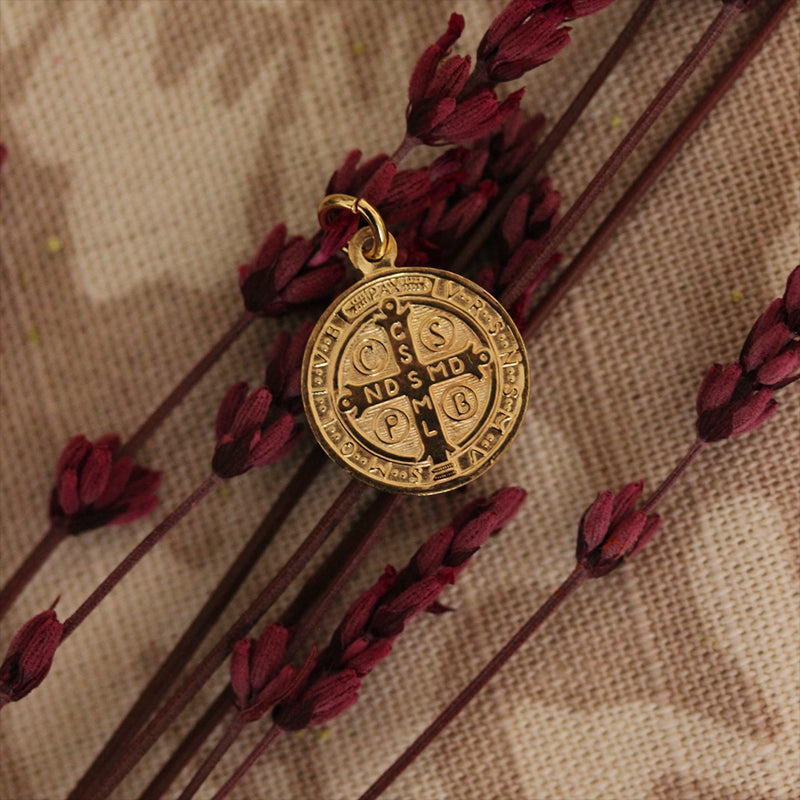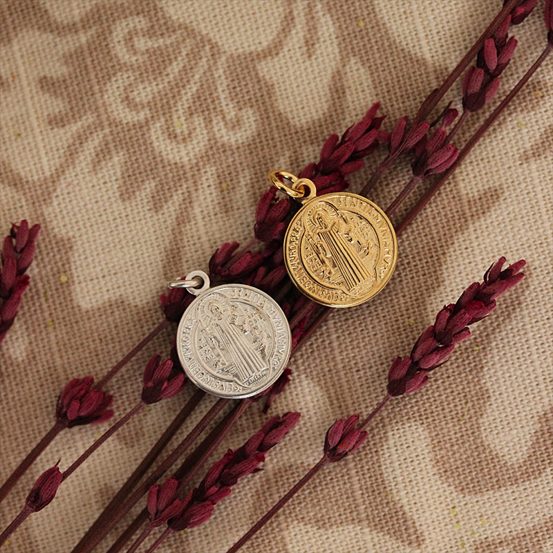 Medalla de San Benito fabricada en plata de 925 mls chapada en oro de 18 Kilates. Tiene 18 mm de diámetro.