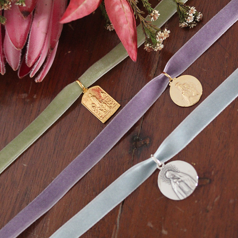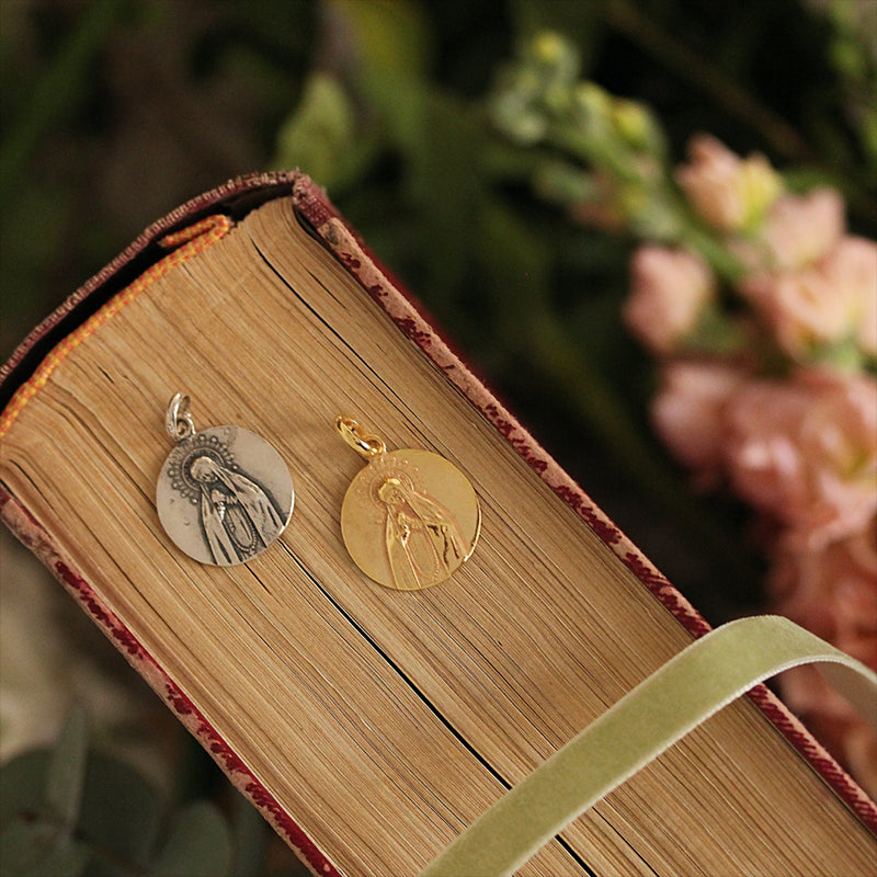Disponible en plata. Tiene  20 mm de diámetro. Añade la fecha en la parte del sagrado corazón. Elige la cinta de terciopelo para el ramo. Y si quieres, añade una cadena de plata o plata chapado en oro para que luego pueda llevarla colgada siempre consigo.