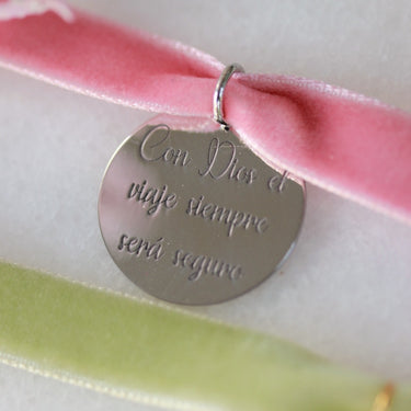 La medalla con la frase ``Con Dios el viaje siempre será seguro´´ es lo más especial que puede llevar una novia el día de su boda. Está fabricada en plata de 925 mls.