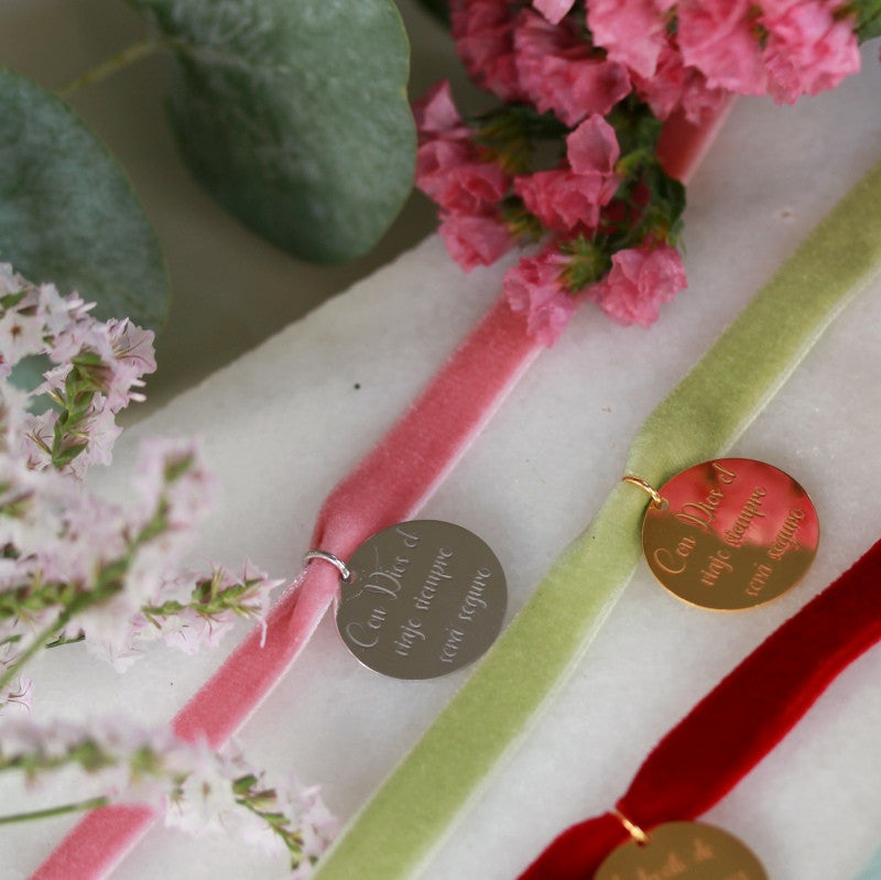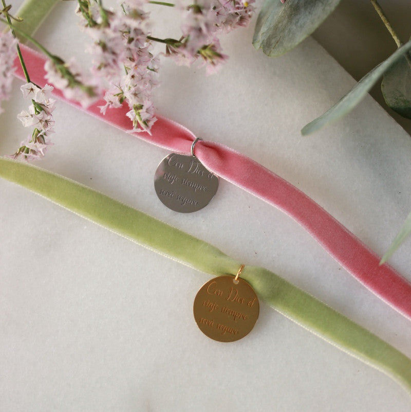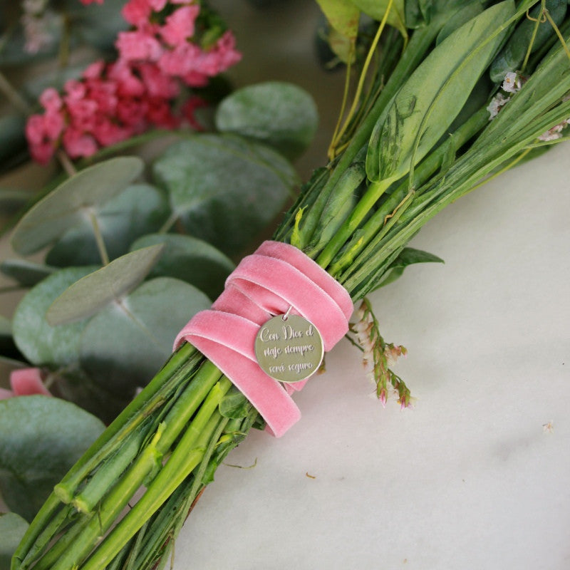 Puedes elegir si la quieres en plata o en plata chapado en oro. Tiene 20 mm de diámetro. Añade la fecha y elige la cinta de terciopelo para el ramo. Y si quieres, añade también una cadena de plata o plata chapado en oro para que luego pueda llevarla colgada siempre consigo.