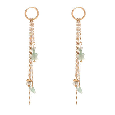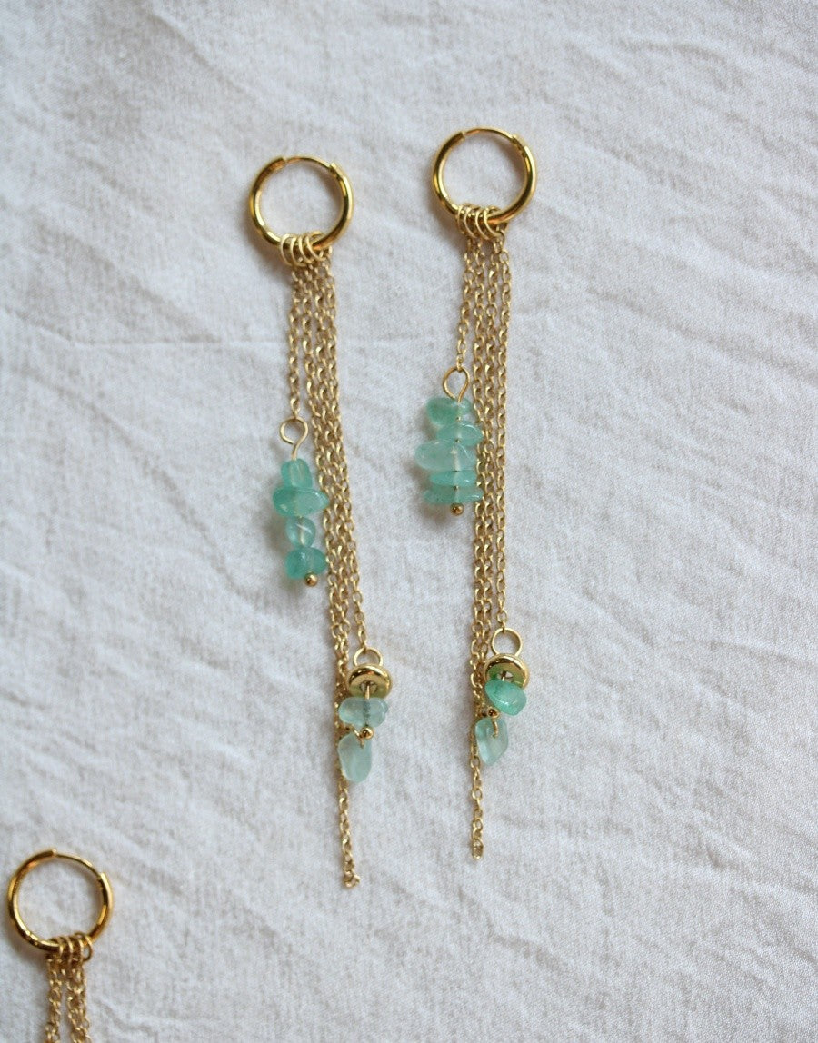 Los pendientes Dasa Mineral Verde forman parte de la colección de pendientes de acero Doña Sol. Unos pendientes ideales y con mucho movimiento que podrás utilizar para tus look de invitada o de diario . Están formados por un aro y cuatro cadenas de diferentes tamaños de las que cuelgan piedras de minerales de color verde que aportan suavidad y serenidad. Se puede utilizar solo el aro o en su conjunto. Fabricados en acero inoxidable y piedras minerales aventurinas.