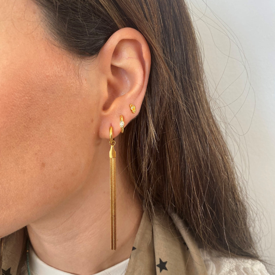 Los pendientes Tikka forman parte de la nueva colección de pendientes de acero Doña Sol. Pendientes largos resistentes al agua perfecto para todos tus looks tanto de diario como arreglados.