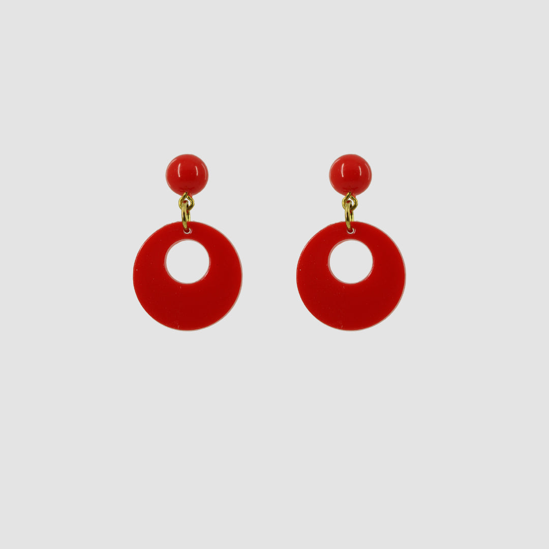 Fabricados en acetato con cierre tuerca. Unos pendientes de aro muy ligeros lo cual los hace perfectos para que las niñas los lleven durante horas. En color rojo para alegrar cualquier look de flamenca.