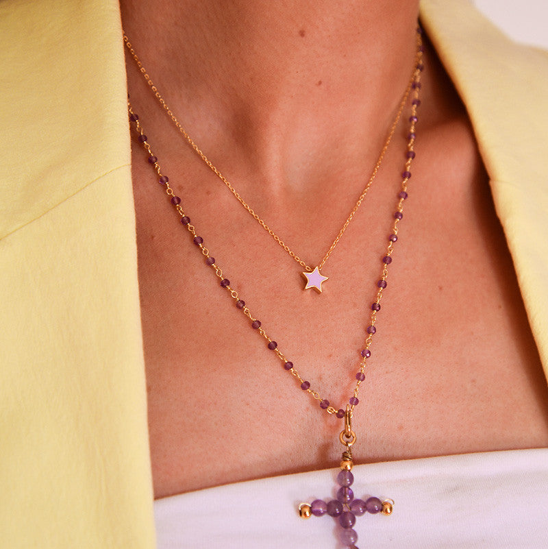 Estrella esmaltada en color lila con cadena de 38 cm de largo con posibilidad de extensión hasta 44 cm. El colgante Star Lila forma parte de la nueva colección de verano.