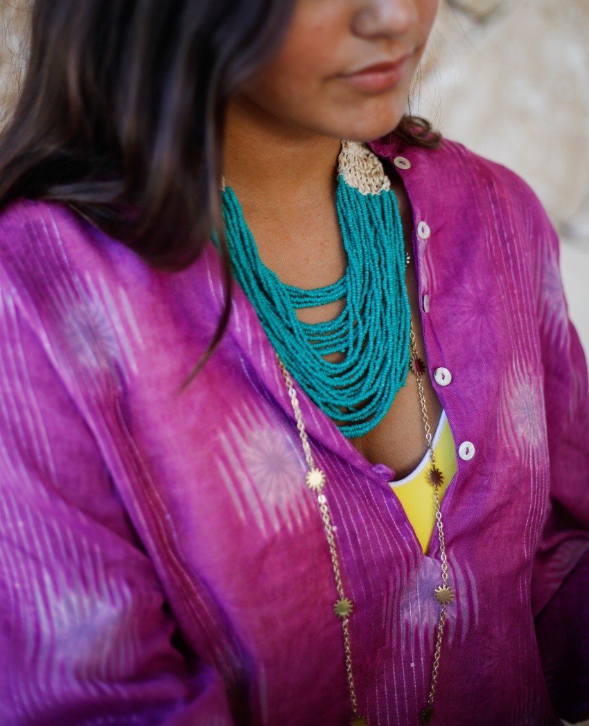 El Collar Coco forma aparte de la nueva colección de collares de verano Doñasol. Un collar alegre, favorecedor y que sin duda dará un cambio total en tus looks.