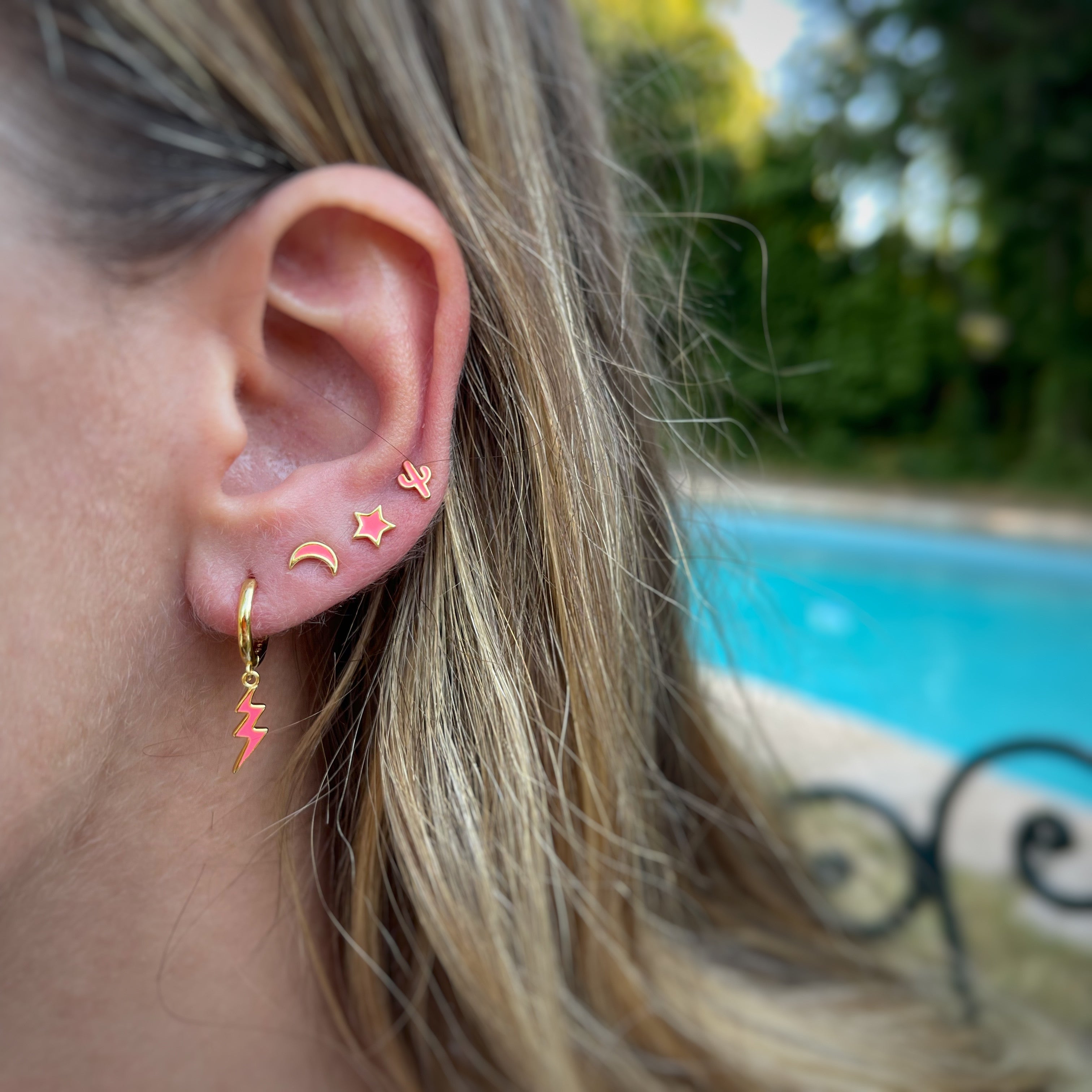 Son unos pendientes muy cómodos. Pequeños y no pesan nada. Perfectos para combinarlos con más pendientes de Doña Sol. Disponible el par o la unidad. El aro es de 11 mm de diámetro y el rayo mide 12 mm de largo por 3 mm de ancho aproximadamente.