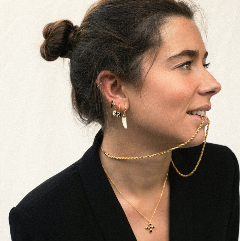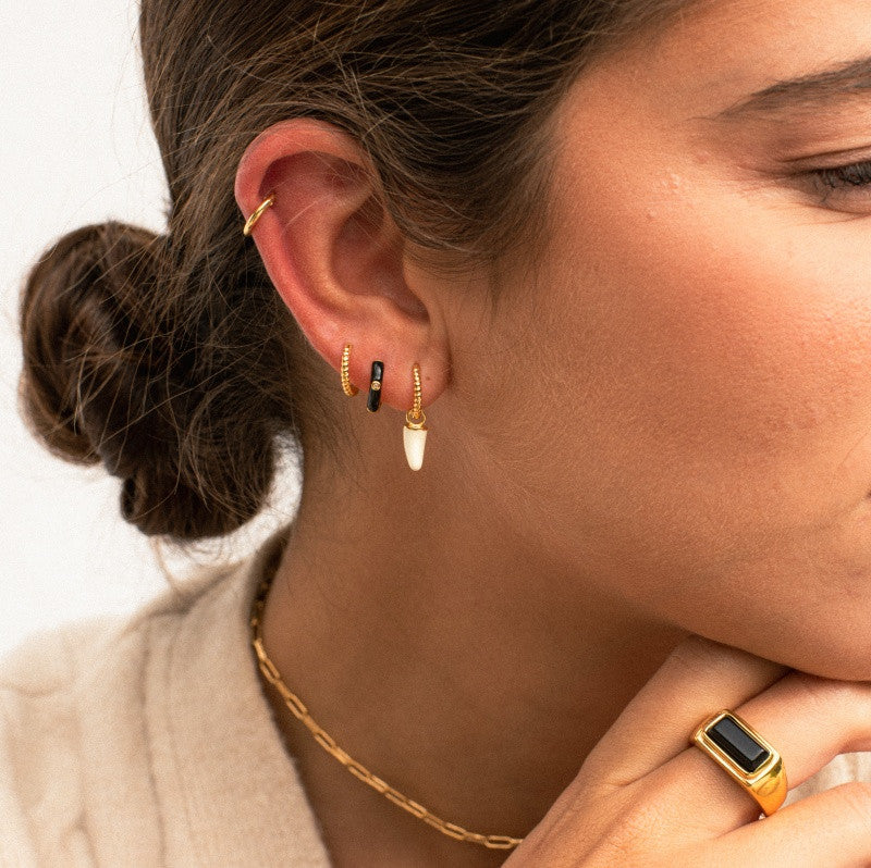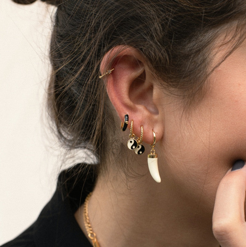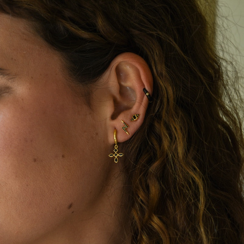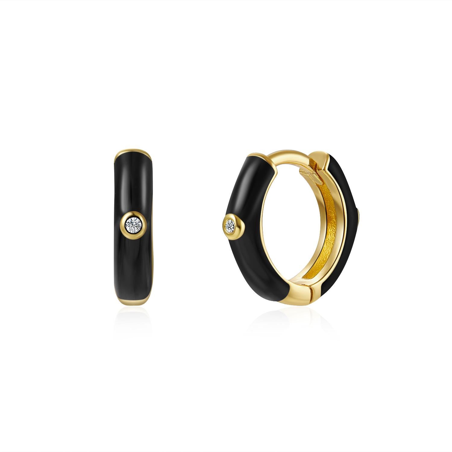 Los pendientes Buffy están fabricados en plata de 925 mls y un baño de oro de 18 kts. Aros pequeños con una circonita incrustada y un esmaltado de color negro que se convertirán en uno de tus imprescindibles.