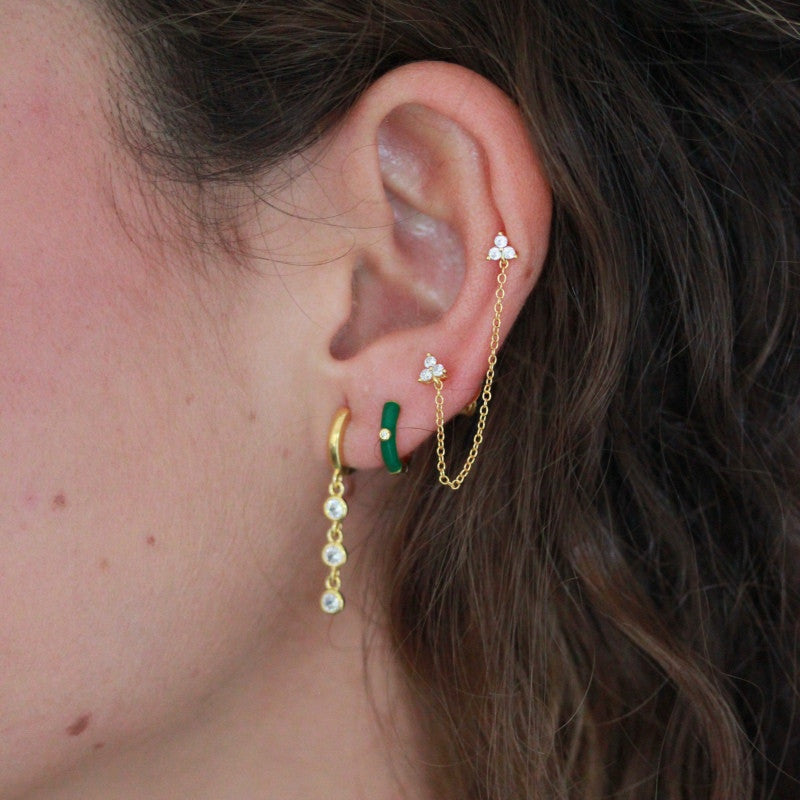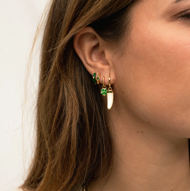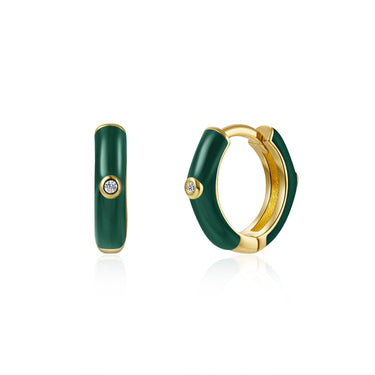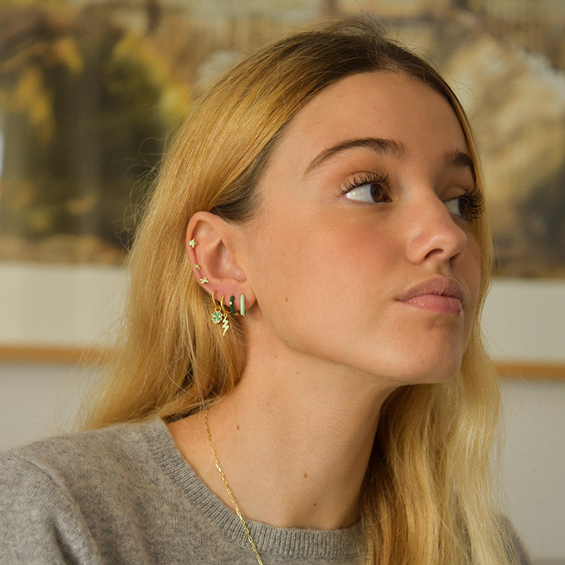 Los pendientes Buffy están fabricados en plata de 925 mls y un baño de oro de 18 kts. Aros pequeños con una circonita incrustada y un esmaltado de color verde que se convertirán en uno de tus imprescindibles.