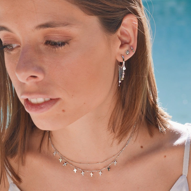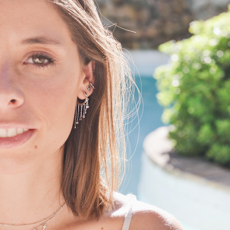 Formados por un aro de 15mm del que cuelgan 6 cadenitas de menor a mayor longitud. Cada cadenita acaba con una chapita con una circonita incrustada. ¡Pendientes de moda súper favorecedores y cómodos! Puedes comprar el par o la unidad.