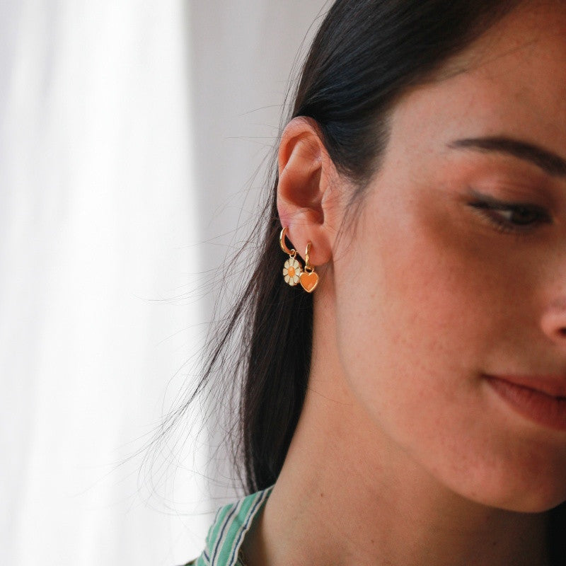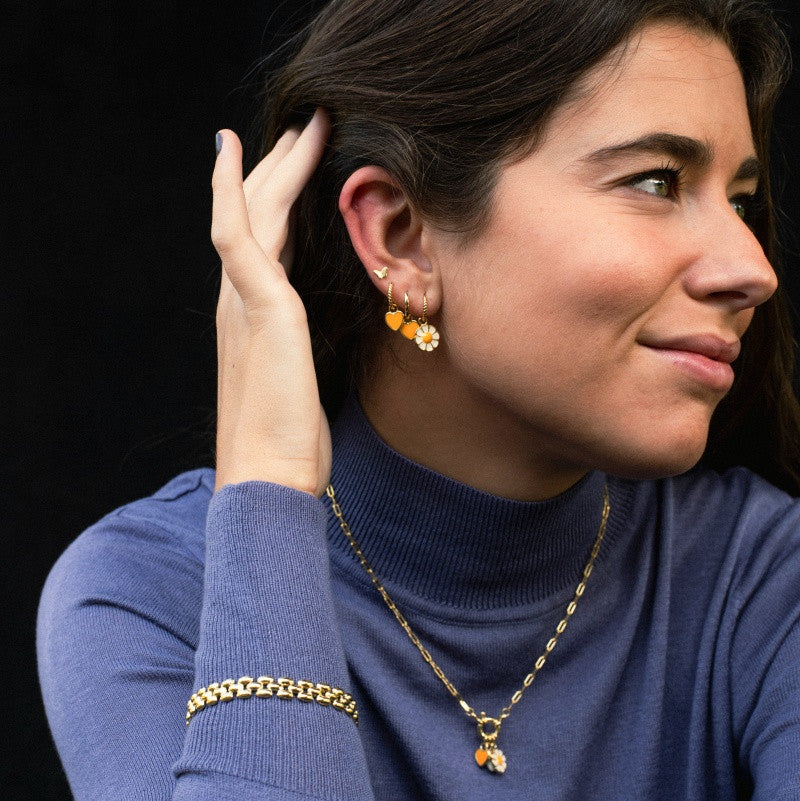 Los pendientes Lisse Mustard Love forman parte de la nueva colección de aros y charms. Fabricados en plata de 925 mls con un chapado en oro de 18 kts y un corazón esmaltado en ocre.