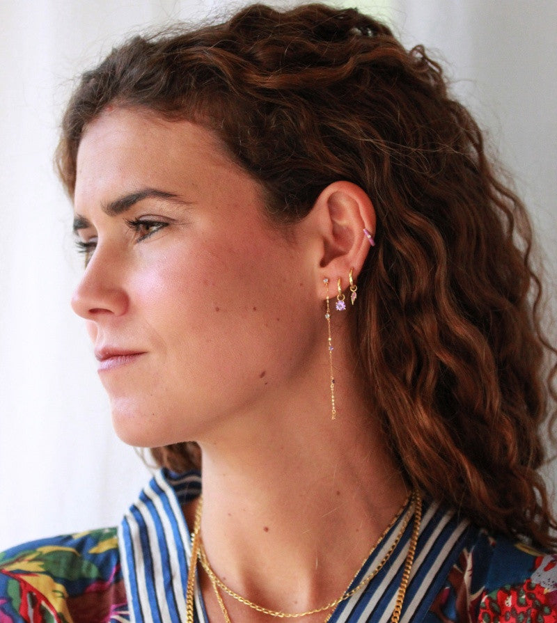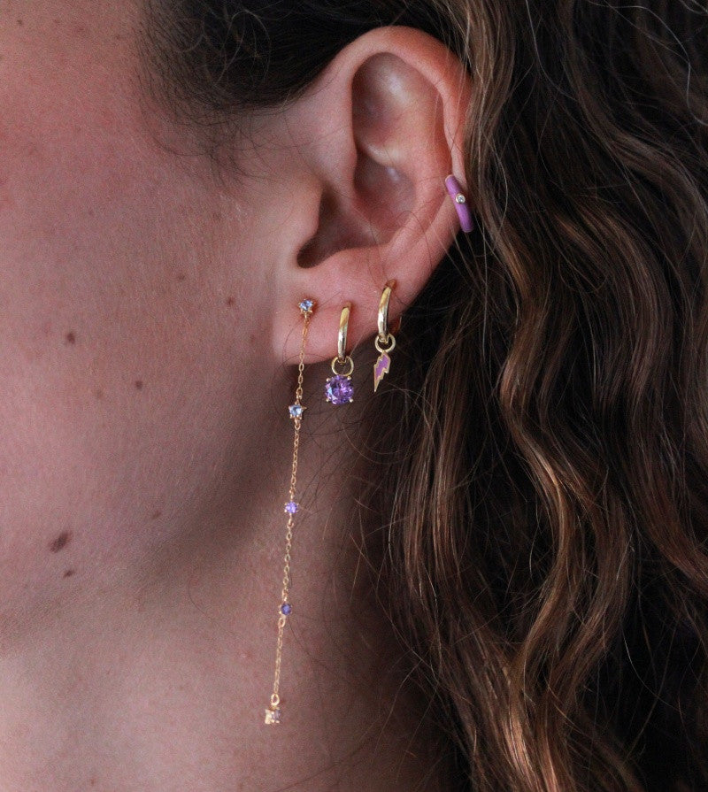 Los pendientes Lisse Zircon forman parte de la nueva colección de aros y charms. Fabricados en plata de 925 mls con un chapado en oro de 18 kts y una circonita de color amatista.