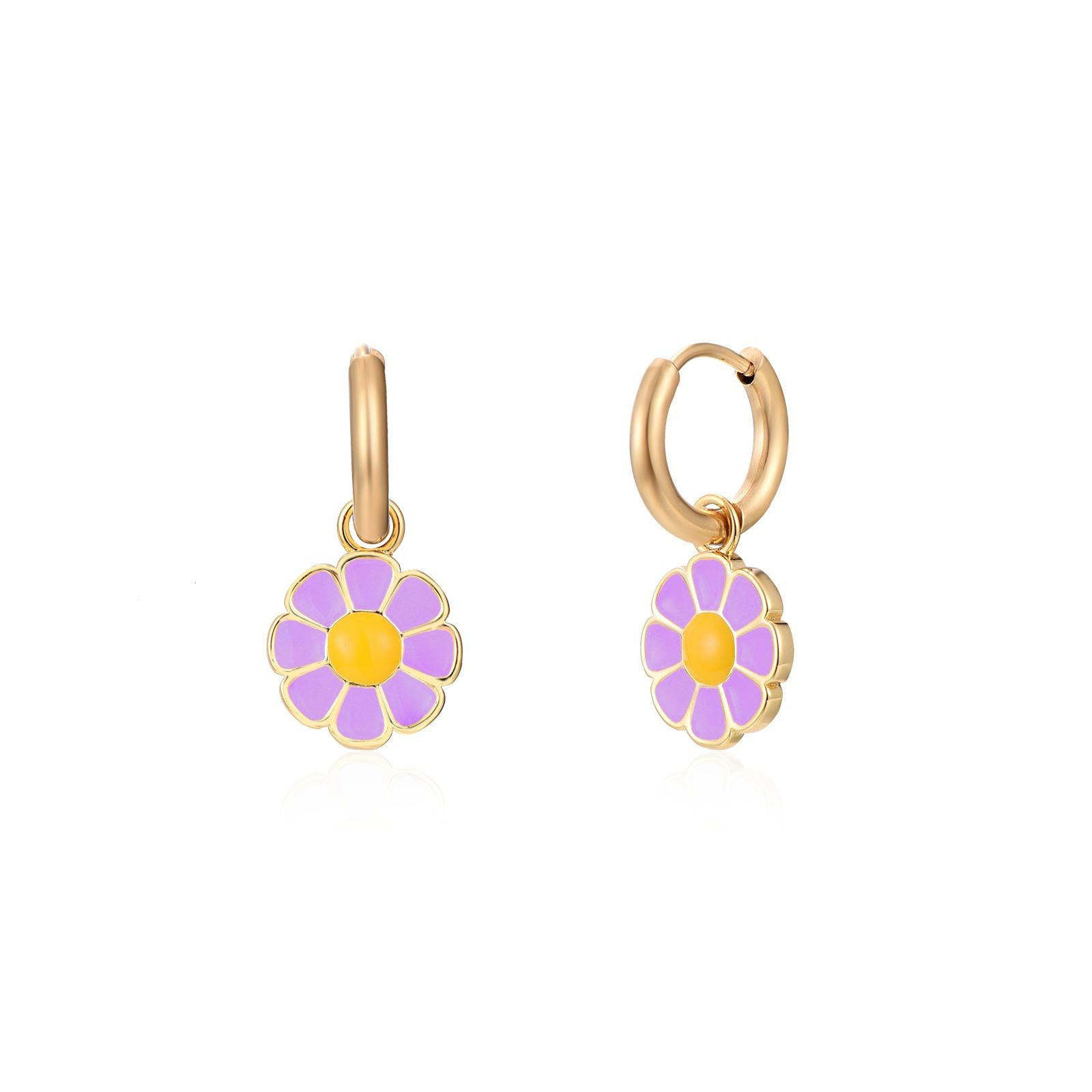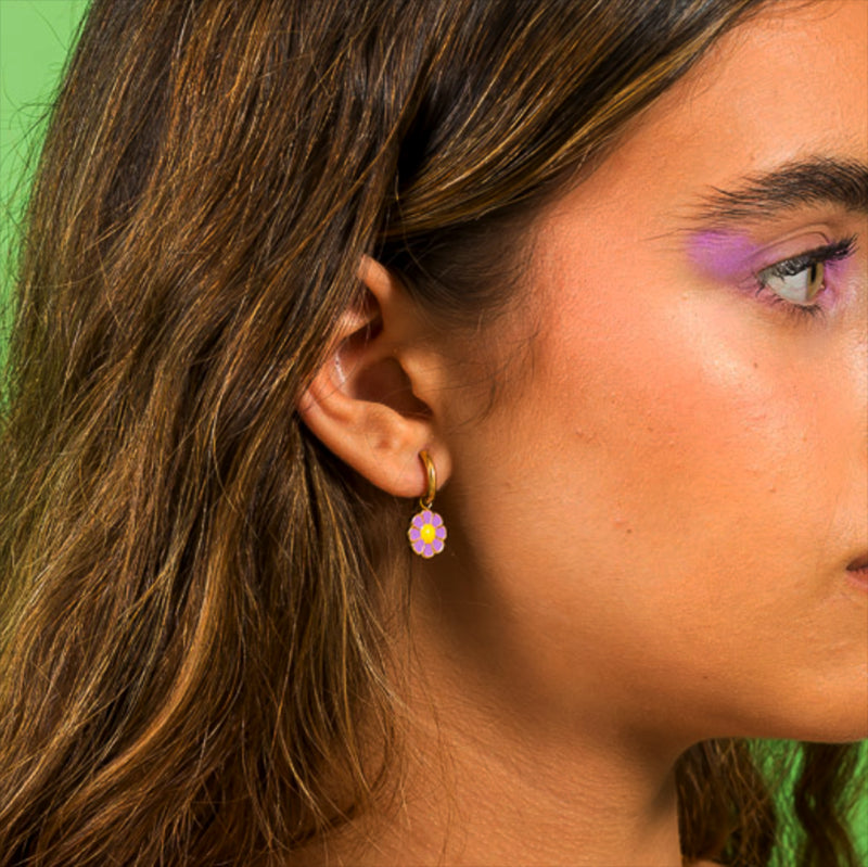 Pendientes pequeños con muchas combinaciones porque puedes llevar el aro con o sin el charm. Están formados por un arito liso de 11 mm de diámetro y una flor esmaltada de 11 mm de diámetro. No pesan nada y puedes comprar el par o la unidad.