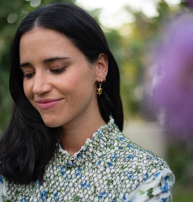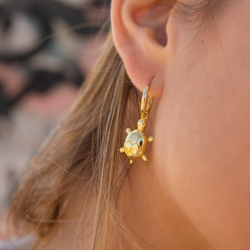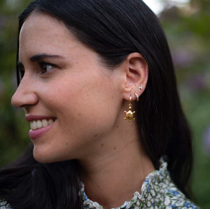 Los pendientes tortuga son los pendientes de aro de la nueva colección que no pueden faltar en tu joyero esta temporada. Fabricados en plata de 925 mls y un baño de oro de 18 kts.