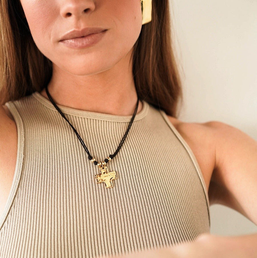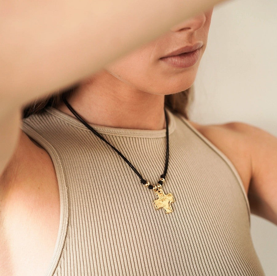 El collar cruz cordón forma parte de la nueva colección de collares de Doña Sol. Un collar que podrás usar con miles de looks. Gracias a su acabado irregular aporta muchísima luz al rostro