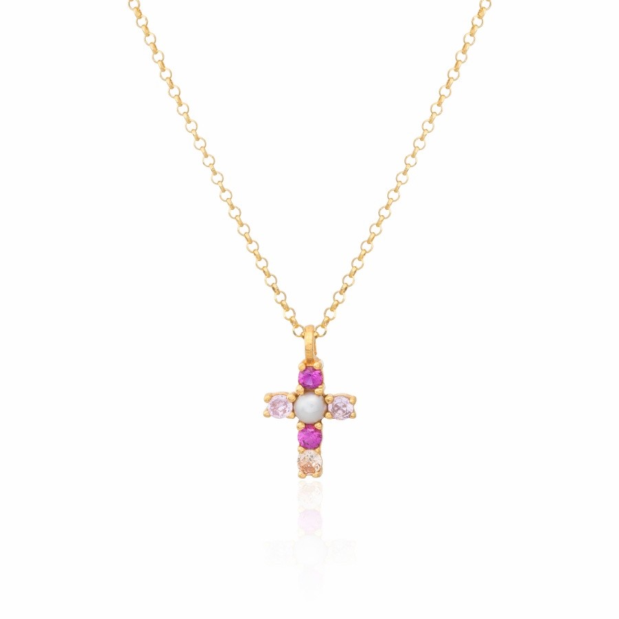 Colgante con diseño de cruz elegante, decorado con circonitas de colores y una perla natural en el centro.