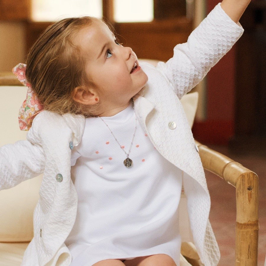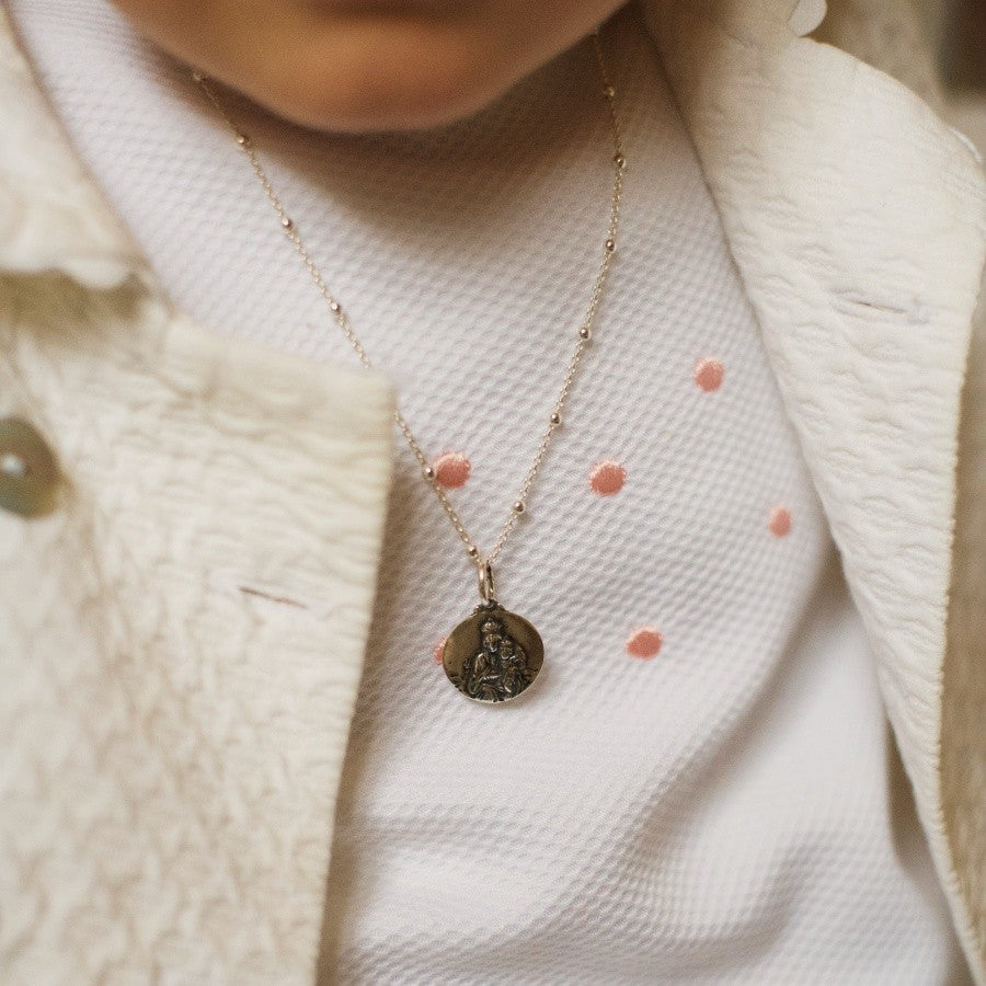 Nuestra medalla del Escapulario del Carmen está realizada en plata de ley 925 mls. Va montada en nuestra cadena pearl y lo mejor que tiene esta cadena es que tiene alargador por lo que podrás ajustar la cadena al largo de cada niña. ¡Un regalo ideal!