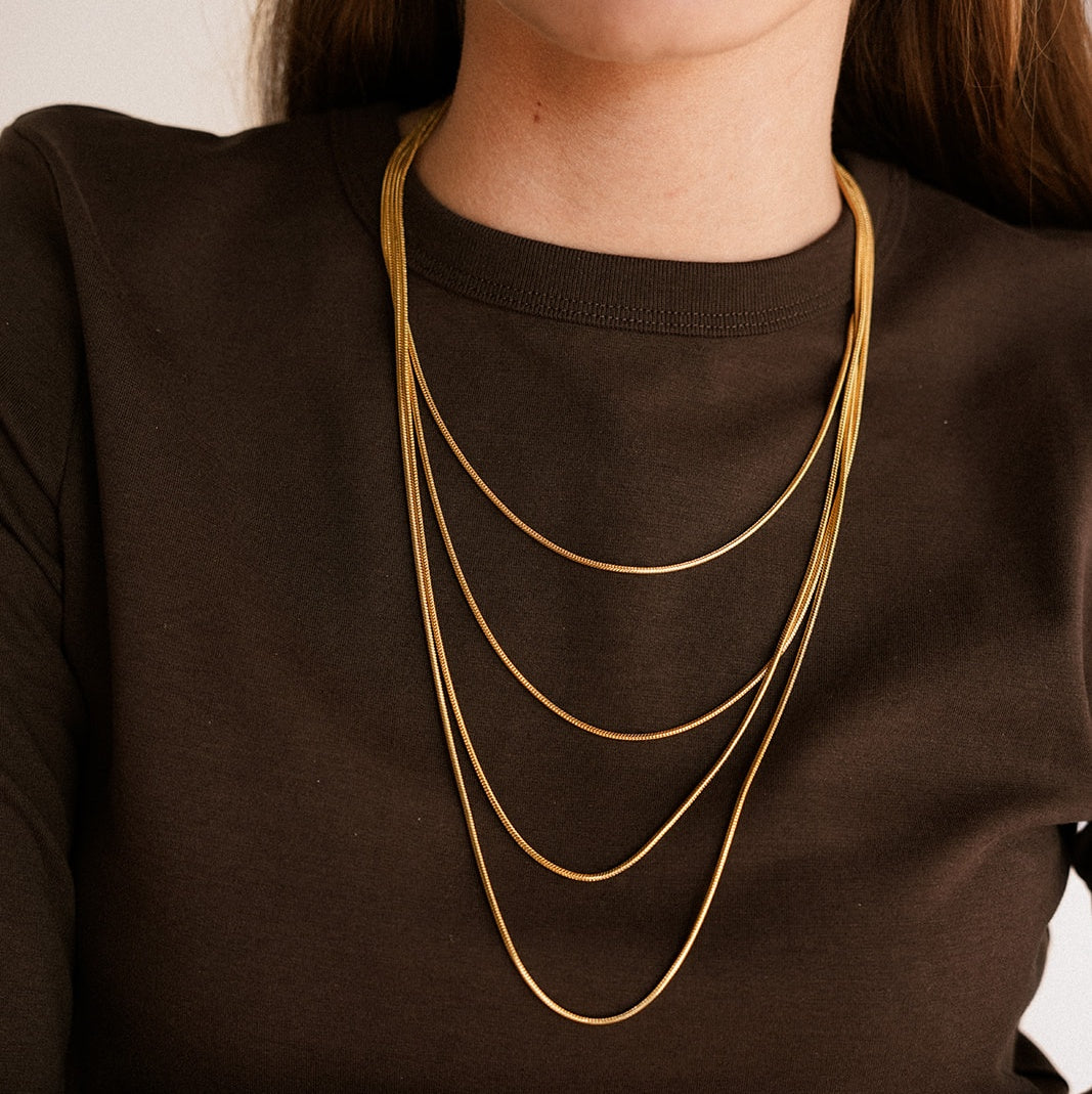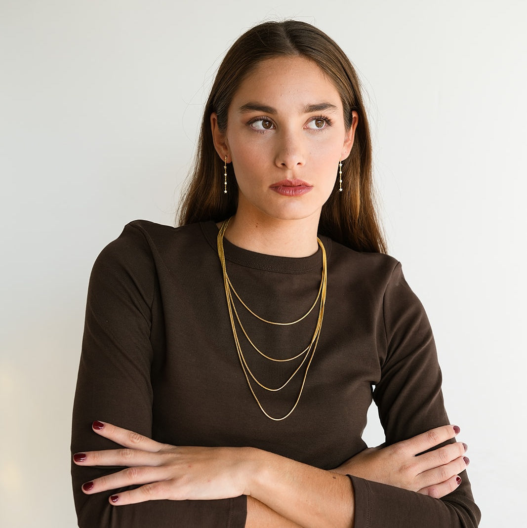 Collar Santorini. Fabricado en latón con chapado en oro de 24 kilates. Un collar con un diseño muy llamativo que no pasará desapercibido. Un diseño juvenil y fresco. Nos encanta para combinarlo con camisetas sencillas en el día a día y como toque final de un look de invitada. Compuesto por 4 cadenas con diferentes largos. Tiene mucho movimiento.