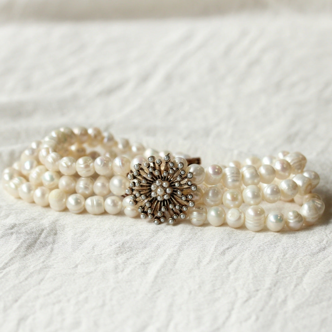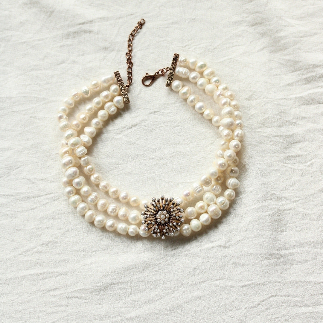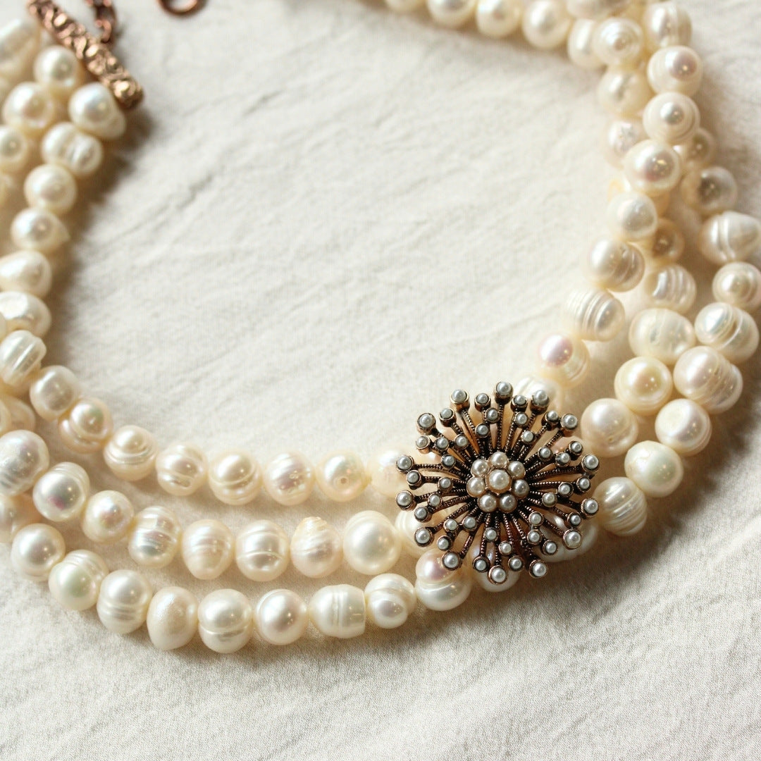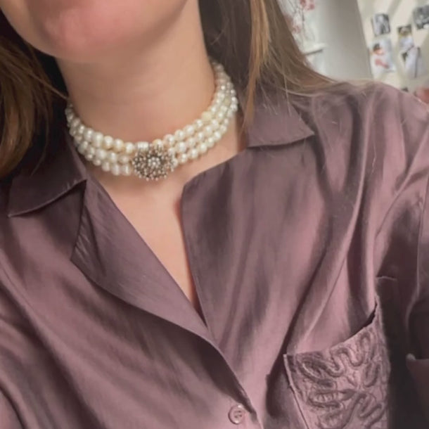 Gargantilla de perlas cultivadas con broche vintage. Gargantilla única y exclusiva protagonista de tus looks más especiales. Fabricado a mano con perlas cultivadas seleccionadas. No habrá otra igual.