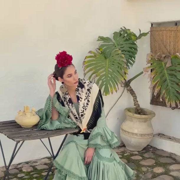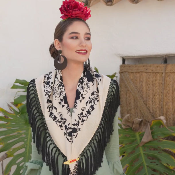 El mantón Rocío forma parte de la nueva colección de mantones de flamenca Doña Sol. Un mantón beige bordado en negro es pura elegancia atemporal. El fondo beis ilumina y suaviza el conjunto, mientras que el bordado negro aporta contraste y estiliza visualmente. Enrejado especial de nudos hecho a mano. Un mantoncillo de inspiración vintage perfecto para darle a tus looks de flamenca ese toque antiguo pero que a la vez nunca pasa de moda.