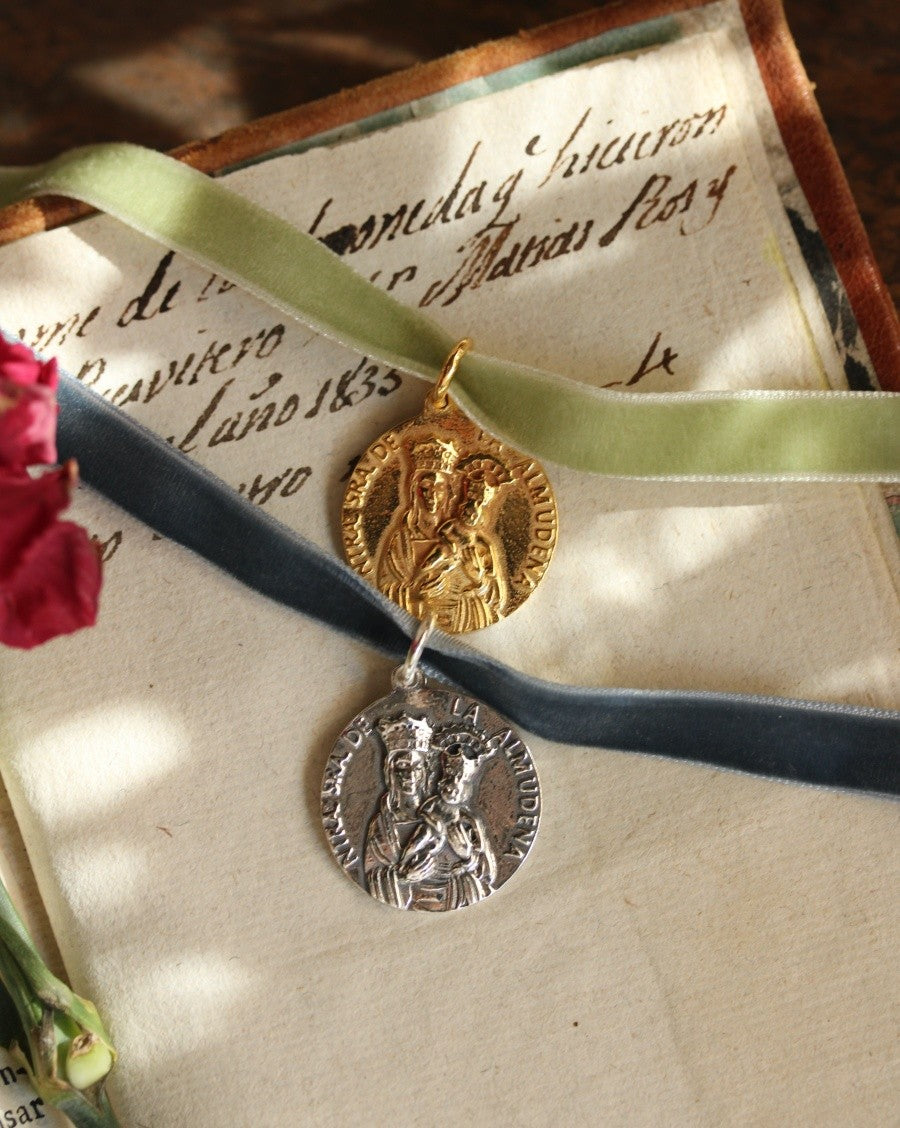 - Parte delantera: Imagen detallada de la Virgen de la Almudena.