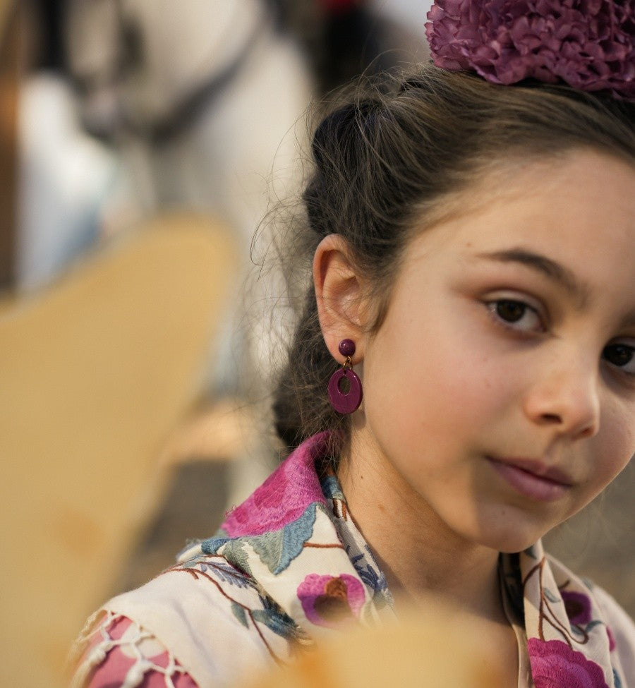 Fabricados en acetato con cierre tuerca. Unos pendientes de aro muy ligeros lo cual los hace perfectos para que las niñas los lleven durante horas. En color Berenjena ideal para combinar con nuestros mantones.